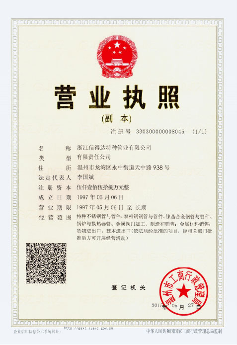 浙江信得達特種管業有限公司成立于1997年,占地面積28000平方米,注冊資金5158萬元,是國家高新技術企業、浙江省專精特新企業,有4家控股公司,產品覆蓋了特種無縫換熱器管、高品質不銹鋼管、鍛壓閥門制造商。